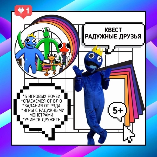Квест основан на игре Роблокс. Радужные друзья. Игрокам нужно будет найти кубики, пройти по следам и не наступить в лужу, иначе Фиолетовый утянет в вентиляцию, найти при помощи фонариков батарейки, устроить батл между Синим и Зелёным монстрами и, конечно, не попасться в лапы Синего (Блю) ???? В финале фотосессия с настоящим Синим Радужным другом!