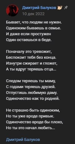 Пишу я анкету уже не в первый раз,но все же с людьми не складывалось по тем или иным причинам. Порой люди просто бросали свои страницы,пропав в небытие. От чего все же моя душа пребывала в разных состояниях и ещё больше покрывалась пеплом и сашей огорчений . Так что можно считать я очень почерствел за это время,даже где-то закрыл ряд эмоций и их выражения,терпя «давку» до момента,когда останусь наедине с собой и возможностью быть не дёрнутым кем-то. Стоит добавить,что части моих планов оказалось не суждено было случиться по некоторым причинам, в том числе связанных с текущими событиями, что только ухудшило мою менталку.