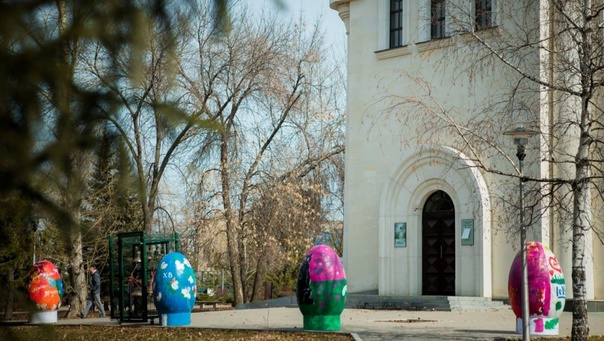 В Уфе аллею перед храмом в сквере 50-летия Победы украсили огромными пасхальными яйцами, которые расписаны вручную.