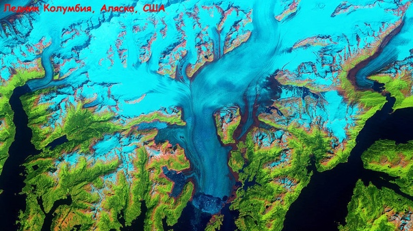Снимок ледника Колумбия, Аляска, США. Этот ледник спускается с Колумбийского ледникового поля к подножию Чугачских гор и уходит в воды пролива Принс-Уильям на юго-востоке Аляски.
