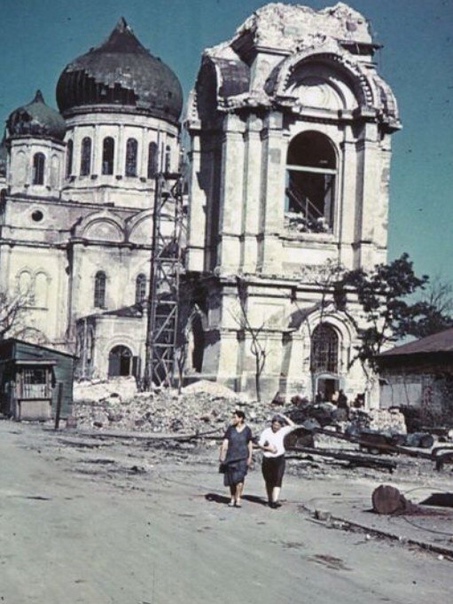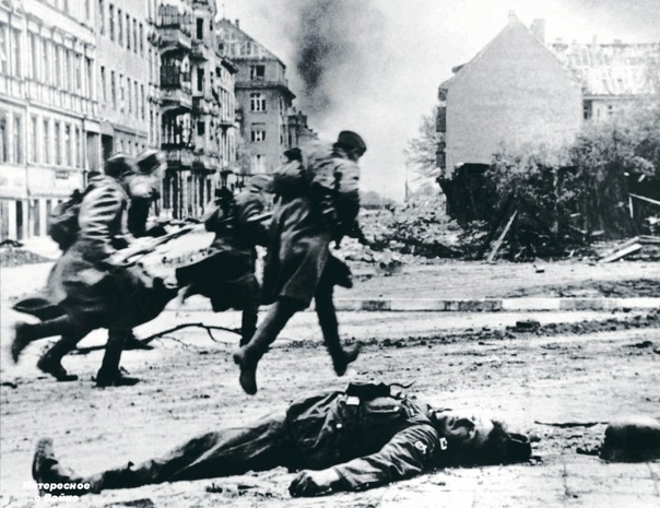 Советские солдаты бегут к новой позиции в бою в Берлине. Примечательна фигура убитого немецкого сержанта из RAD (Reichs Arbeit Dienst, допризывной трудовой службы) на переднем плане — она присутствует и на некоторых других фотографиях из Берлина, в том числе снятых совсем в других местах, например, на знаменитом фото у Бранденбургских ворот.