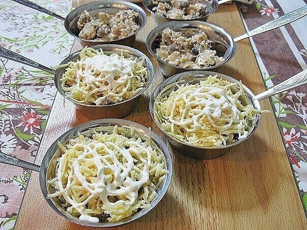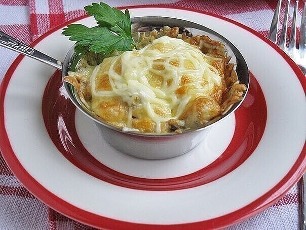 6. Далее раскладываем начинку по формочкам и также можно в качестве формочек использовать и кокотницы. После все посыпаем и тертым сыром и не жалеем его, а для того, чтобы у вас корочка получилась вкусная, ароматная и мягкая, то можно смешать сыр со сметаной.