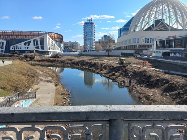Смотрите сколько воды в реке у цирка. В администрации города рассказали журналистам Е1.ру, что это произошло потому, что в городе уже третий год случается засуха.