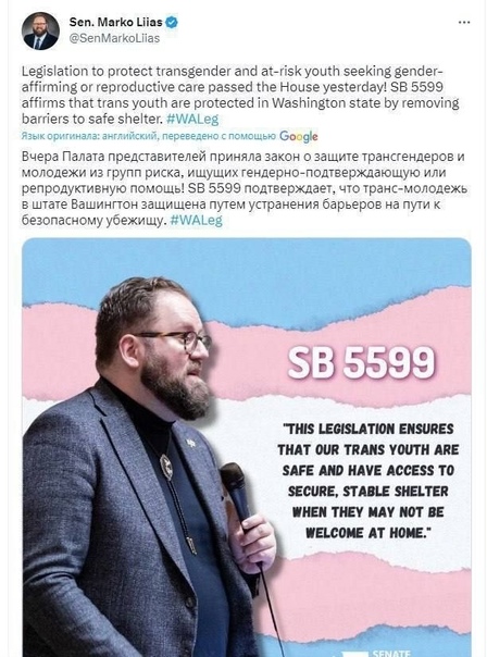 Благодаря закону SB 5599 трансгендерная идеология стала обязательной для каждого родителя. Теперь если родитель не согласен с решением своего ребёнка, власти имеют право его забрать.