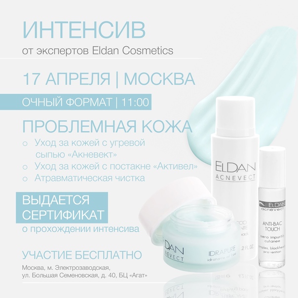 Ждем вас на интенсиве и мастер-классах Eldan Cosmetics очно по адресу:
