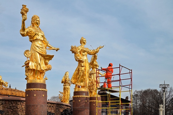 Фонтаны «Дружба народов» и «Каменный цветок» на ВДНХ готовят к открытию сезона. В них много позолоченных скульптур, декоративных медных и бронзовых элементов, поэтому сооружения требуют бережного ухода и промываются исключительно вручную. Работы займут пять дней, их выполнят специальные бригады.