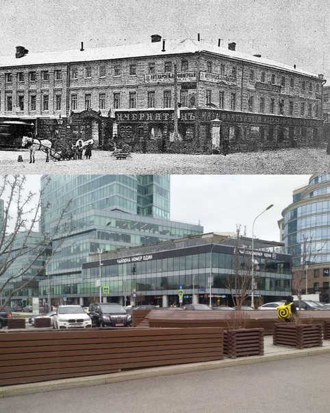 Трубная площадь. Чёрно-белая фотография из журнала «Московскiй листокъ» за 9 декабря 1901 года. Перед вами трёхэтажный дом купчихи Кононовой с надписью «Мануфактурный магазинъ Чернятина». До Чернятина, который торговал на Трубе стройматериалами, тут был известный трактир «Крымъ». При Брежневе дом был снесен. На этом месте построен Дом политпросвещения Московского горкома КПСС, но его тоже снесли в нулевые.