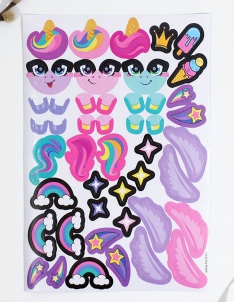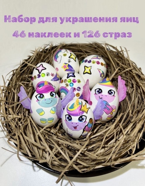 ????В комплекте 1 лист с наклейками и стразы для украшения 6 яиц для создания милых и забавных единорогов
