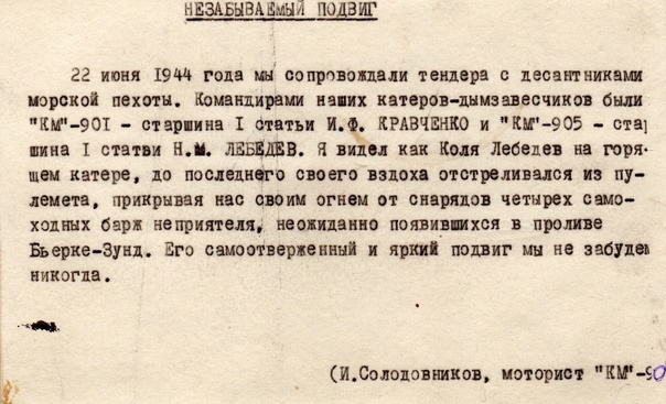"В боях за освобождение островов Пийсаари и Бьерке 22 июня 1944 года в неравном бою с превосходящими силами кораблей противника погиб смертью храбрых, но не отдал освобожденной советской земли командир катера Николай Лебедев.