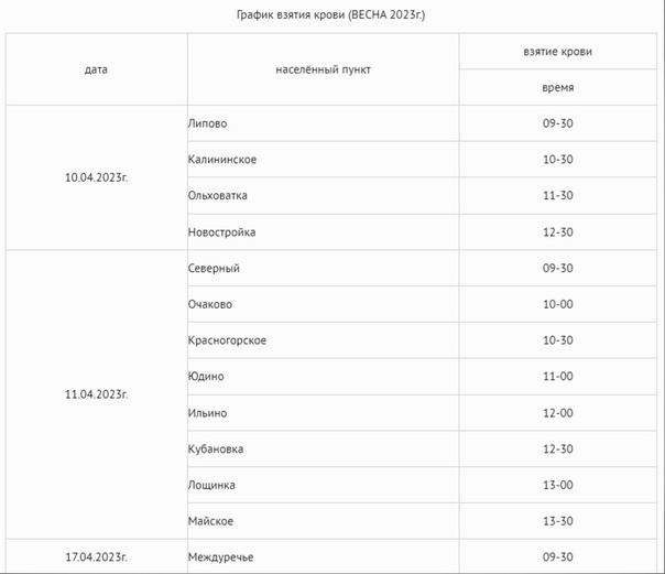 Опубликован график взятия крови весной, в поселках...
