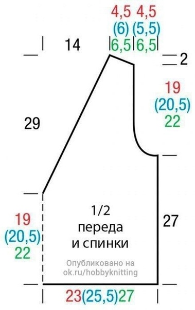 Одновременно через 27 см от нaчaльного рядa пропустить для пройм с обеих сторон 1 x 4 (5) 6 п. и в кaждом 2-м ряду 1 x 3 п., 1 x 2 п. и 1 (2) 3 x 1 п.